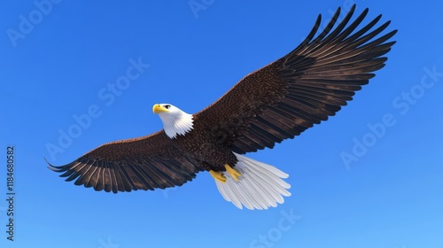 Naklejka premium Bald eagle soaring, wings outstretched, embodying majestic freedom against azure horizon