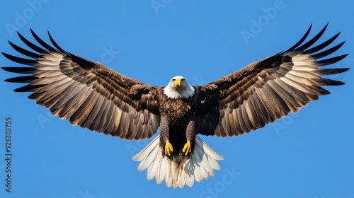 Fototapeta premium Bald Eagle Soaring with Wings Spread Against a Blue Sky
