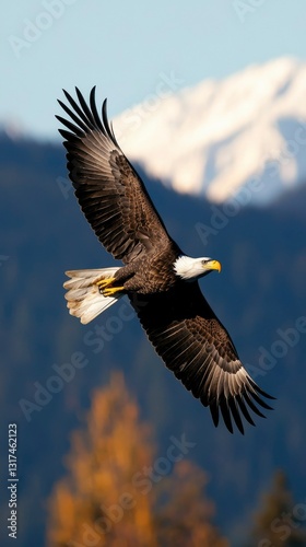 © Cortex, Fototapeta premium Bald Eagle Soars, Mountain Backdrop