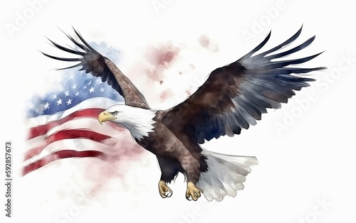 © Oksana, Fototapeta premium Bald eagle takes flight in front of the American flag createrd with Generative AI technology. American independence day