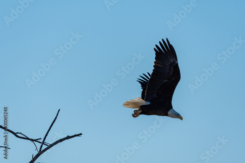 Obraz premium Bald Eagle taking flight from tree on a sunny day