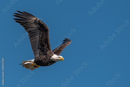 © jgorzynik, Naklejka premium Bald Eagle with a Fish in its Talons over the Susquehanna River