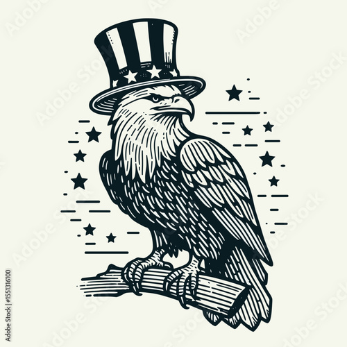 © Syphoera, Naklejka premium Bald Eagle with american flag overlay top hat Perched upright. Independence Day 4th of July Patriotism Usa America Clipart Line Art Vector Illustration. .