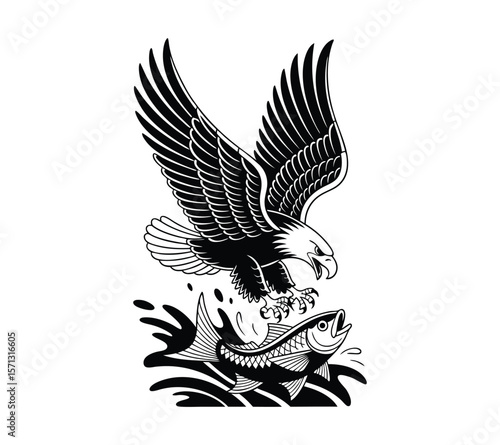 © Smartcare, Obraz premium Bald Eagle with fish hunt Salmon in Talons, Isolated Black and White Art