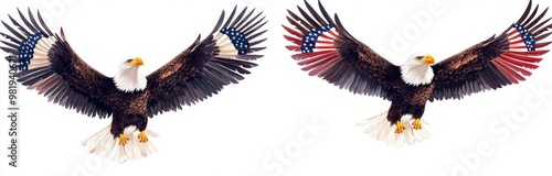 © Monchisa, Fototapeta premium Bald Eagles with American Flag Wings, four distinct bald eagles adorned with vibrant American flag wings, , white background, intricately detailed and high resolution