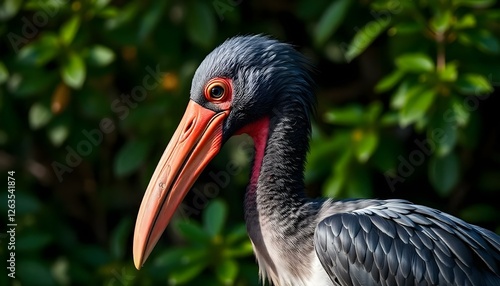 Naklejka premium Bald Ibis in profile, vivid beak and face against lush green foliage