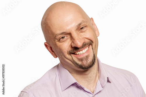 © Анна Демидова, Obraz premium Bald man laughing, close-up, isolated