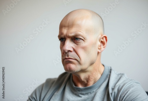 © iushakovsky, Obraz premium Bald man with scowling face and blurred background