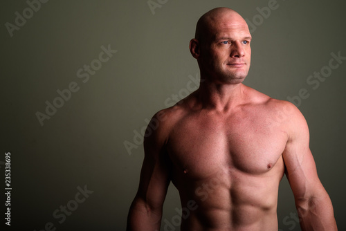© Ranta Images, Fototapeta premium Bald muscular man shirtless against colored background