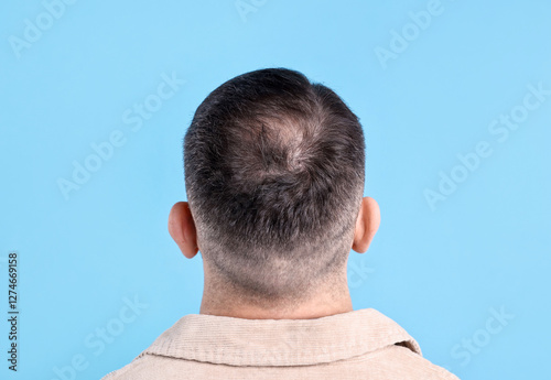 Obraz premium Baldness problem. Man with bald spot on light blue background, back view