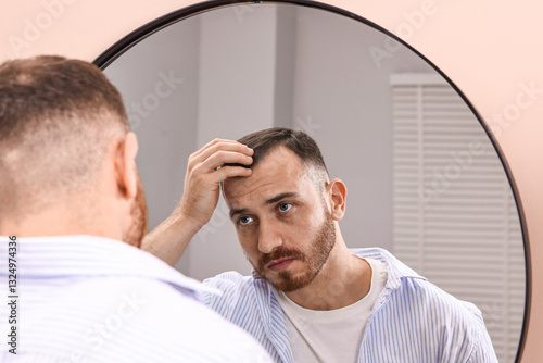© New Africa, Obraz premium Baldness problem. Man with receding hairline near mirror in bathroom