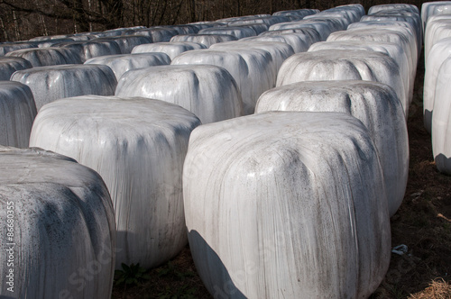 © gabort, Fototapeta premium bale of straw infold in plastic film (foil) to keep dry in autumn