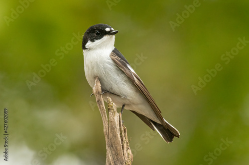 © Monica Viora, Obraz premium Balia nera maschio in su ramo di bosco in primavera