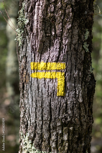 Fototapeta premium Balisage jaune pour indiquer un chemin de randonnée PR (France)