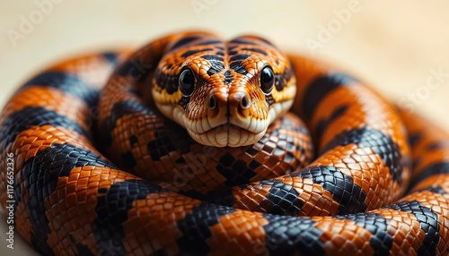 Fototapeta premium Ball Python - Python regius - A stunning ball python with vibrant orange and black scales, coiled elegantly, gazes intensely at the camera. Its captivating eyes and intricate pattern are highlighted a
