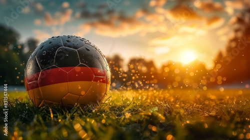 Fototapeta premium Ball with german flag standing on grass of stadium. European football championship UEFA EURO 2024. Generative AI