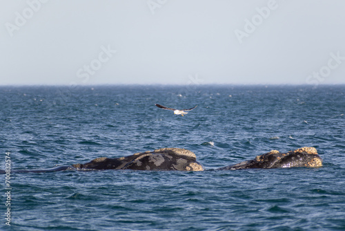 Obraz premium Ballena franca austral con gaviota - Playa el Doradillo - Puerto Madryn -...
