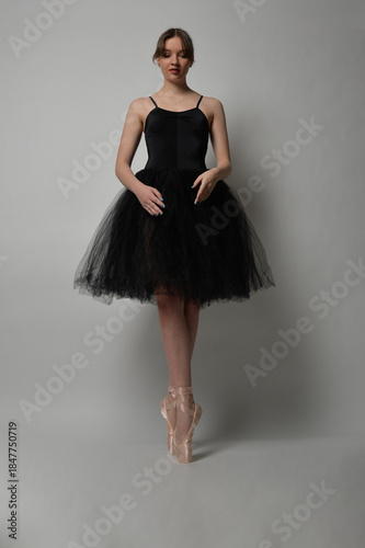 © fotoak80, Naklejka premium ballerina, bekleidung, gestalten, person, leitbild, frau, ballerina, tanzoutfit, tütü, bastrock, schönheit, stil, haar, black, atelier, glamour, posing, leute, elegant, eleganz, bein, rock, 1, körper,