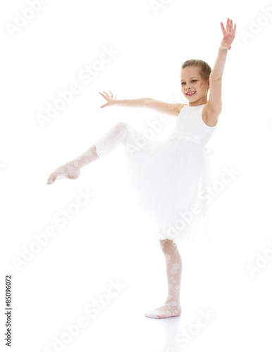 Fototapeta premium Ballerina child raised her leg up and pulling sock