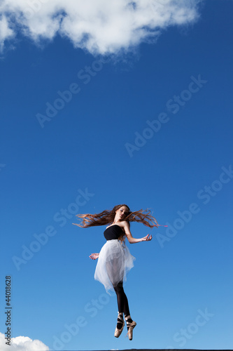 © NinaMalyna, Fototapeta premium Ballerina dancing on the roof, clouds behind her