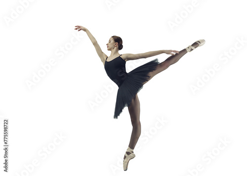 © Alex, Obraz premium ballerina in a black tutu shows an arabesque in a photo studio, isolated on transparent background, png