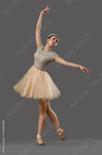 Naklejka premium Ballerina in beige dress and ballet shoes dancing in studio