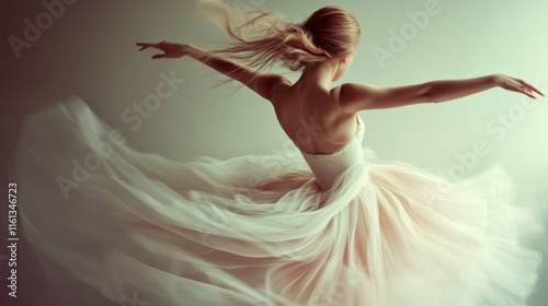 Naklejka premium Ballerina in flowing gown, arms outstretched, back view, dynamic pose.