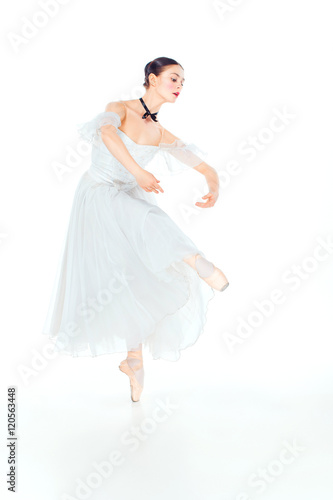 © master1305, Naklejka premium Ballerina in white dress posing on pointe shoes, studio background.