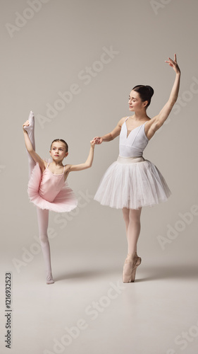 © Lustre Art Group , Naklejka premium Ballerina in white tutu supports little girl, dancer in pink tutu performing leg stretch, emphasizing guidance and flexibility against white background. Concept of ballet, elegance and beauty, grace.