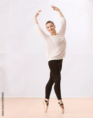 Obraz premium Ballet art concept. Young beautiful ballerina training in dance hall
