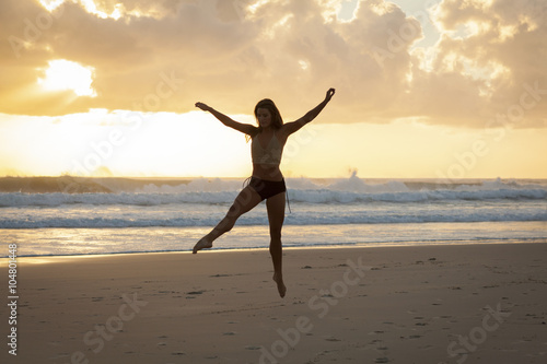 Obraz premium Ballet dancer on beach at sunrise.