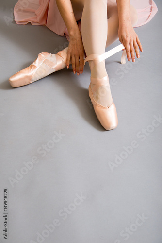 Obraz premium Ballet Dancer Tying Laces On Her Pointe Shoes.