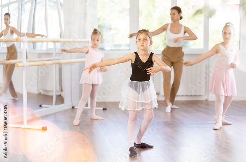 Naklejka premium Ballet lesson for children - choreographer teaches girls ballet steps