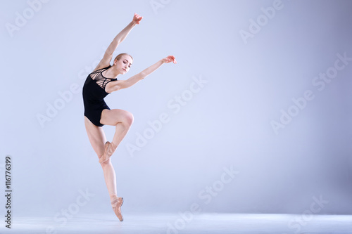 Naklejka premium Ballet Perfection. Young and beautiful ballerina in a black dancing suit is...