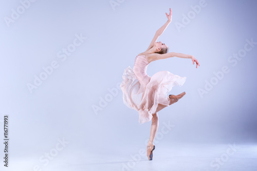 Obraz premium Ballet Perfection. Young and beautiful ballerina is dancing in a white studio...