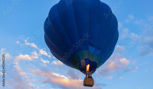 © tatiana, Naklejka premium Balloon Festival Montgolfier, close-up of a bright blue hot air balloon in the air against a blue sky with beautiful pink clouds at sunset, backgrounds, wallpapers, there is copy space in the foto