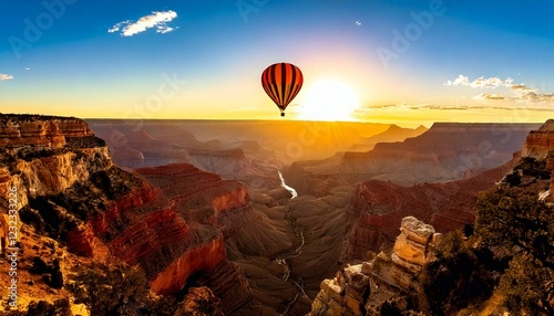 © PandaUniverse, Naklejka premium balloon floating above the Grand Canyon at sunrise-