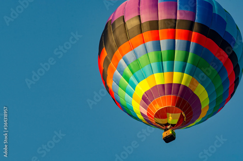 © Valentin Kundeus, Naklejka premium Balloon flying high in the sky. Balloon basket with people. Aeronautic sport. Burning gas. Bright multi-colored balloon. Romantic trip. Free space for text.
