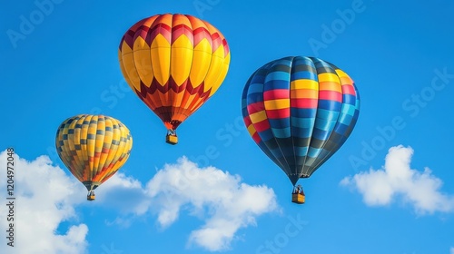 © Chantip, Obraz premium Balloons flying into the blue sky, symbolizing freedom and joyful celebrations