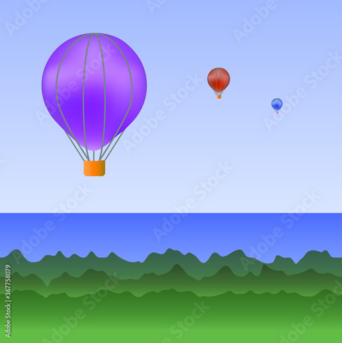 Obraz premium Balony latają nad lasem i morzem, ilustracji wektorowych