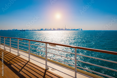 © Nancy Pauwels, Obraz premium Balustrada statku wycieczkowego z panoramą dubaju w tle.