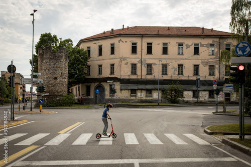 Obraz premium Bambino attraversa città deserta col monopattino, Bergamo
