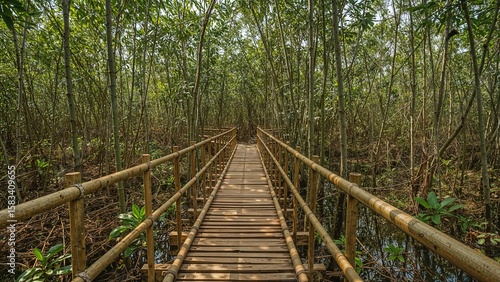 © Giovanni, Obraz premium Bamboo bridge pathway in a dense mangrove forest surrounded by small plants and water reflecting the greenery and natural habitat.