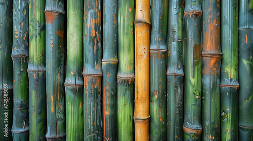 Fototapeta premium Bamboo fence with leaves, copy space.