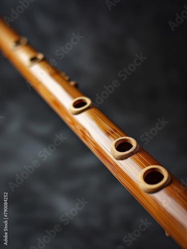 © Jan, Naklejka premium Bamboo flute on a smooth grey surface with copy space.