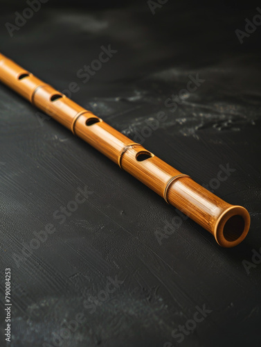 © Jan, Naklejka premium Bamboo flute on a smooth grey surface with copy space.