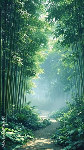 Fototapeta premium Bamboo forest landscape in shades of green and blue, bamboo, green, serene,...