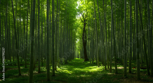 © Siasart, Obraz premium Bamboo Forest Path With Green Trees And Sunlight A Nature Photo