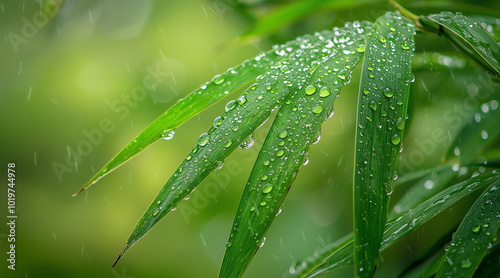 Obraz premium Bamboo forest. Rain has caused water droplets on the leaves. Large bamboo in...