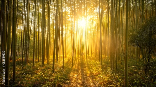 © Radiant Art, Obraz premium Bamboo Forest with soft sunlight